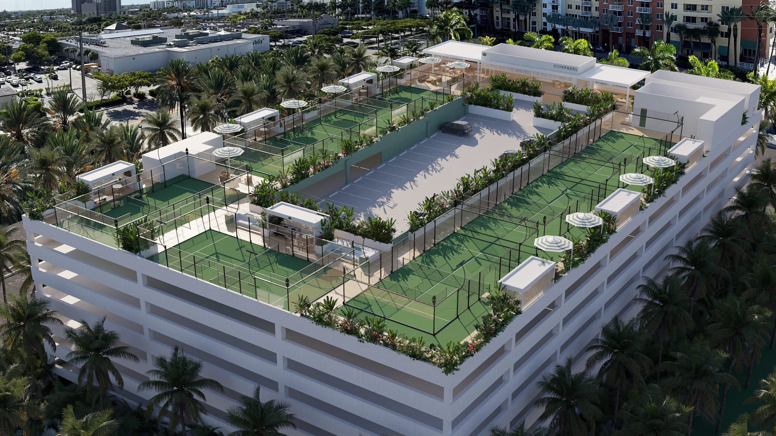 Miami's first covered rooftop luxury padel club with 7 courts, sauna, cold plunge, pilates studio, organic kitchen, and exclusive membership programs. A premium lifestyle-focused offering in Aventura.